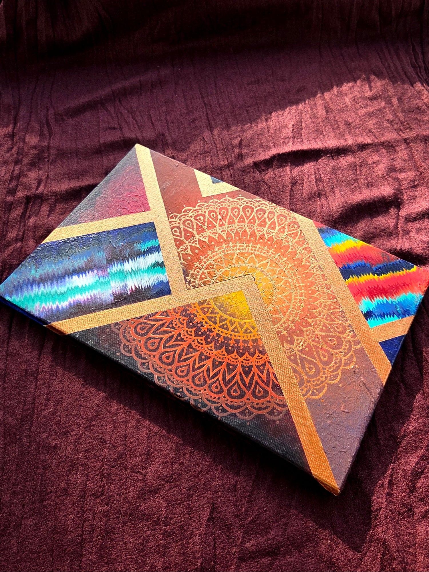 Unveil the magic of light with “Radiant Geometries”, an original hand-painted artwork by Tori Nagay. This unique mandala-inspired piece blends bold geometric shapes, vibrant gradients, and intricate detailing to create a captivating fusion of symmetry and energy.