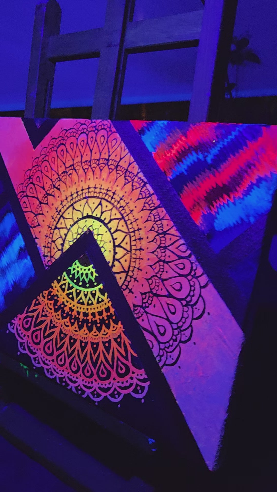 By day, warm tones of red, orange, and gold interplay with woven patterns of teal and indigo, radiating harmony and strength. Under UV light, the painting comes alive - the mandala centerpiece glows in neon hues, transforming the artwork into a mesmerizing psychedelic experience.
